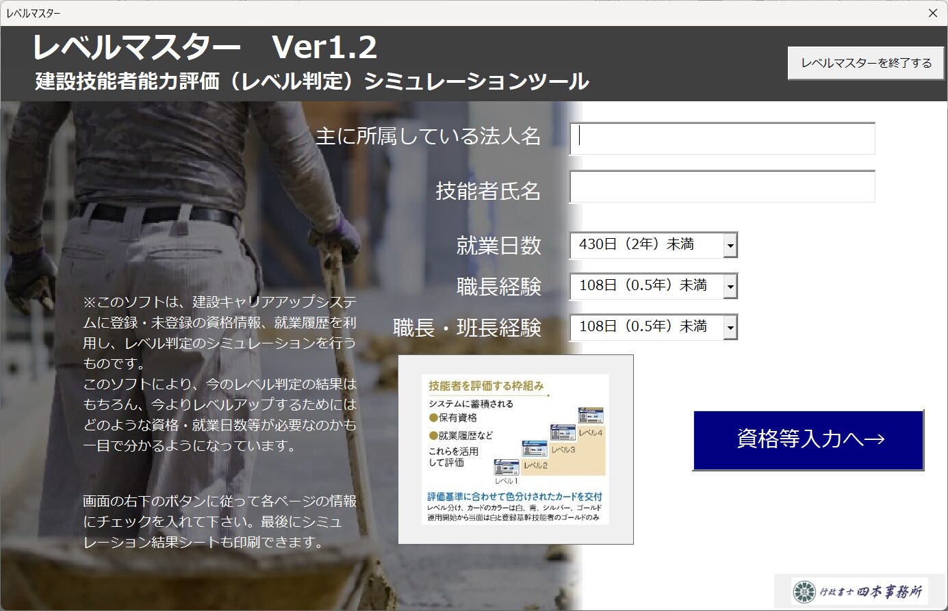 当事務所のIT担当補助者がExcelでできる建設キャリアアップシステム能力評価レベル判定シミュレーションを作りました。